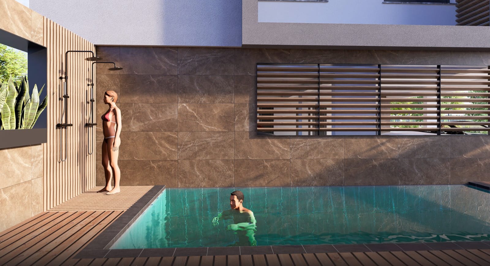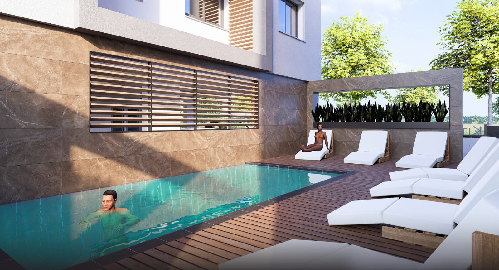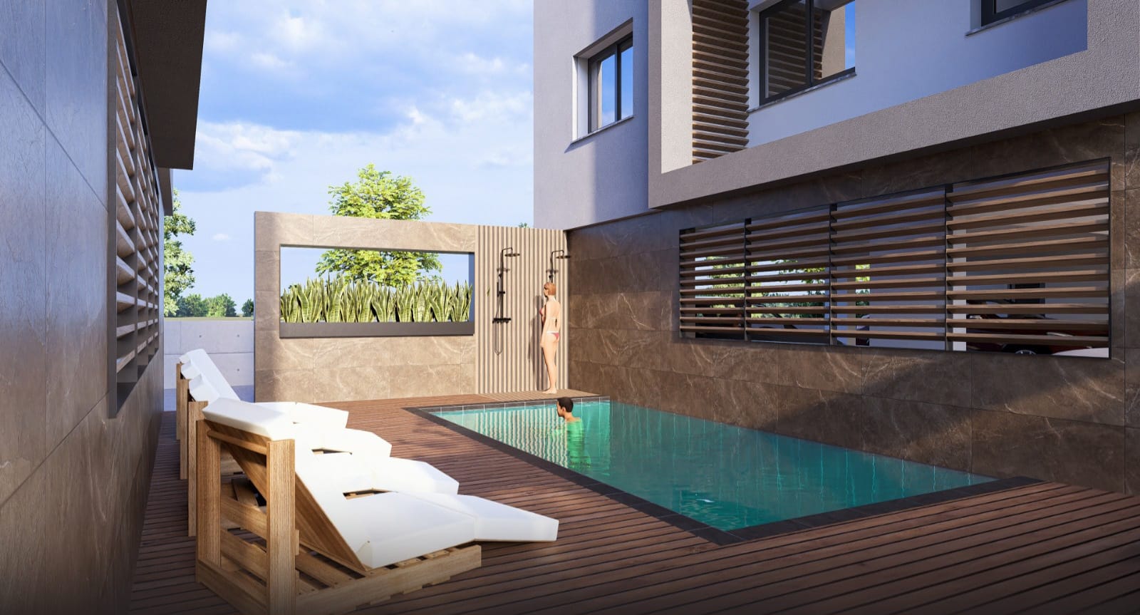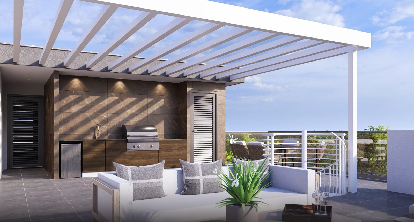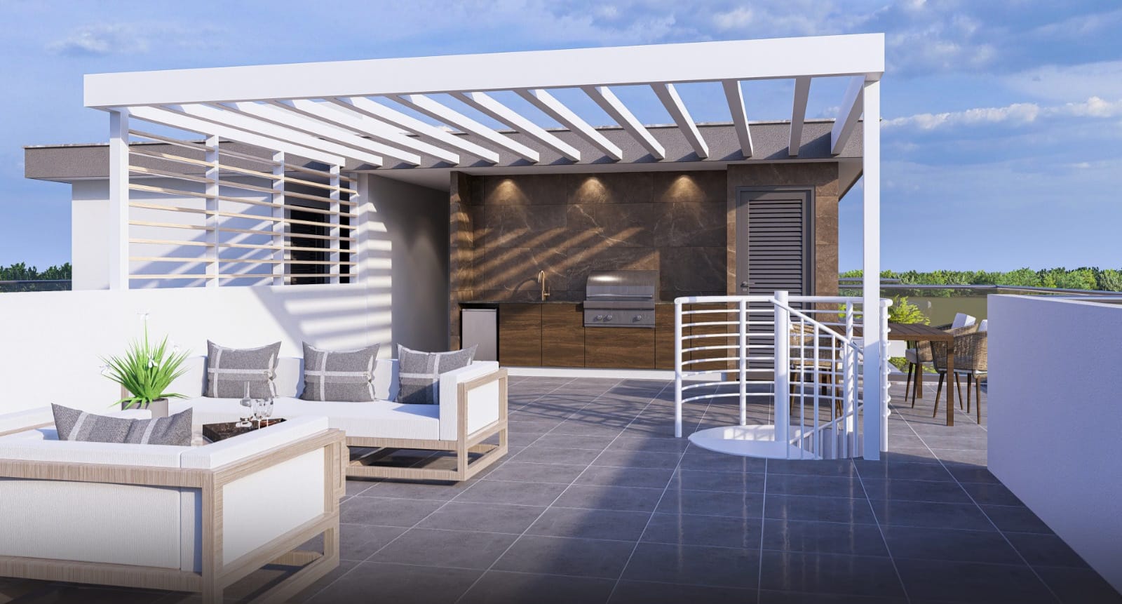 Select second-floor apartments feature private rooftop gardens with provision for jacuzzi and serene views of the peaceful residential neighborhood.