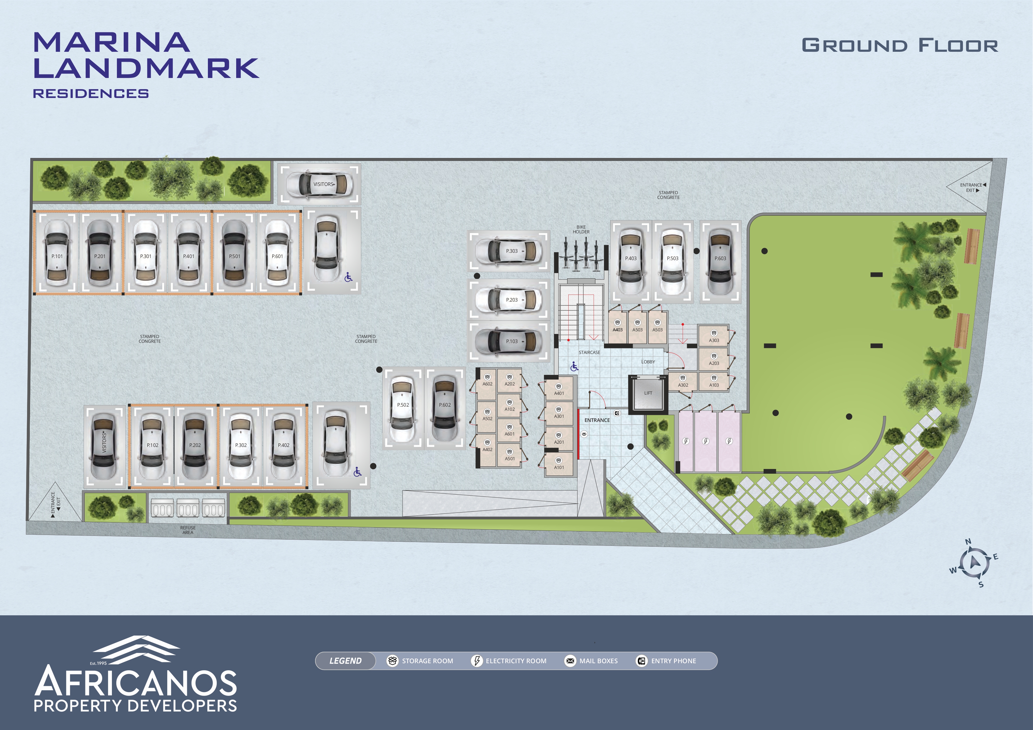 Each apartment includes covered parking and a storage room on the ground floor.