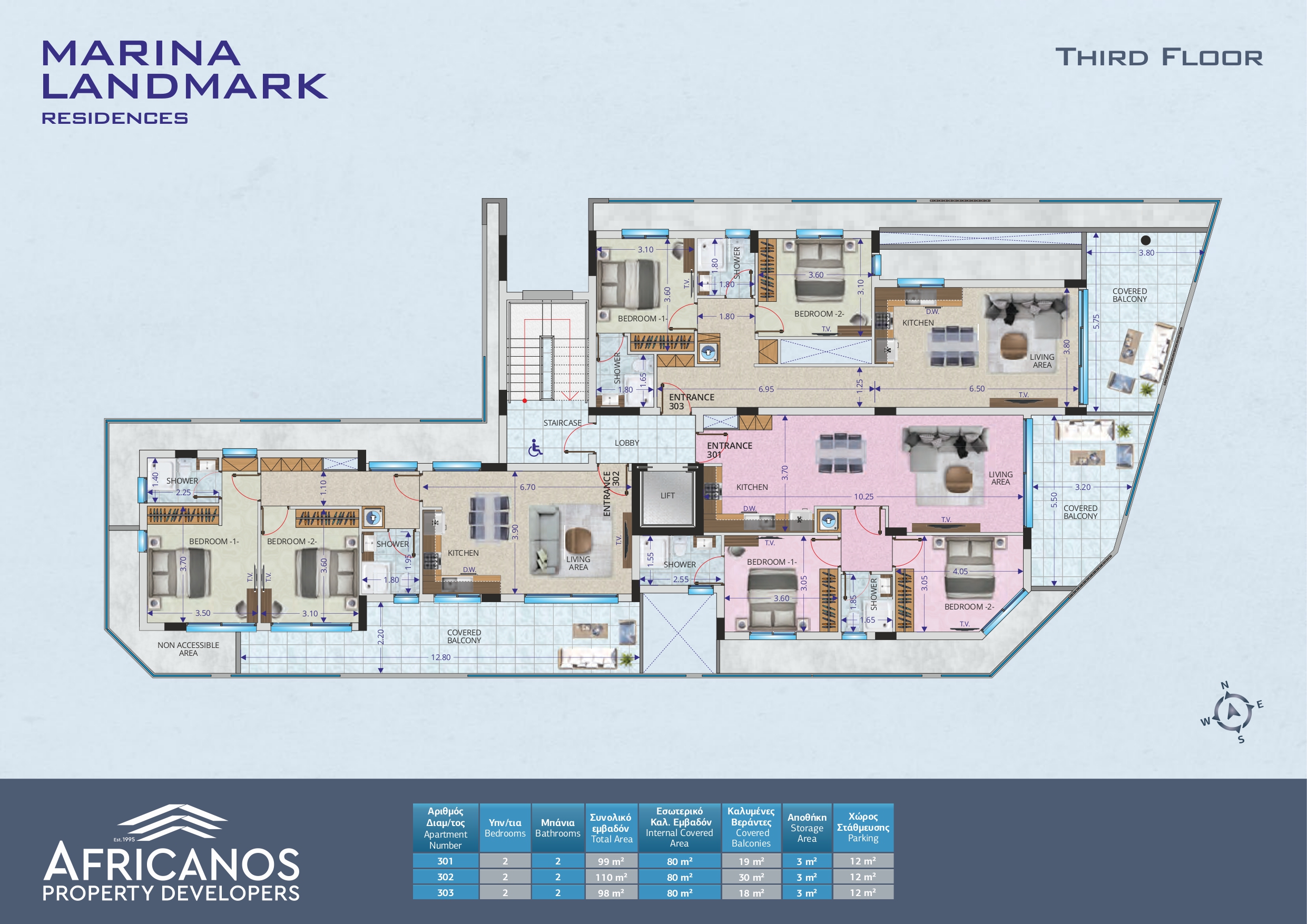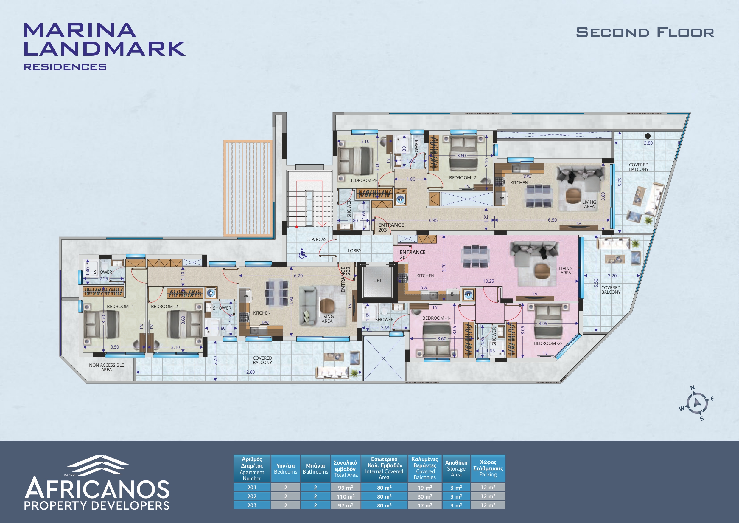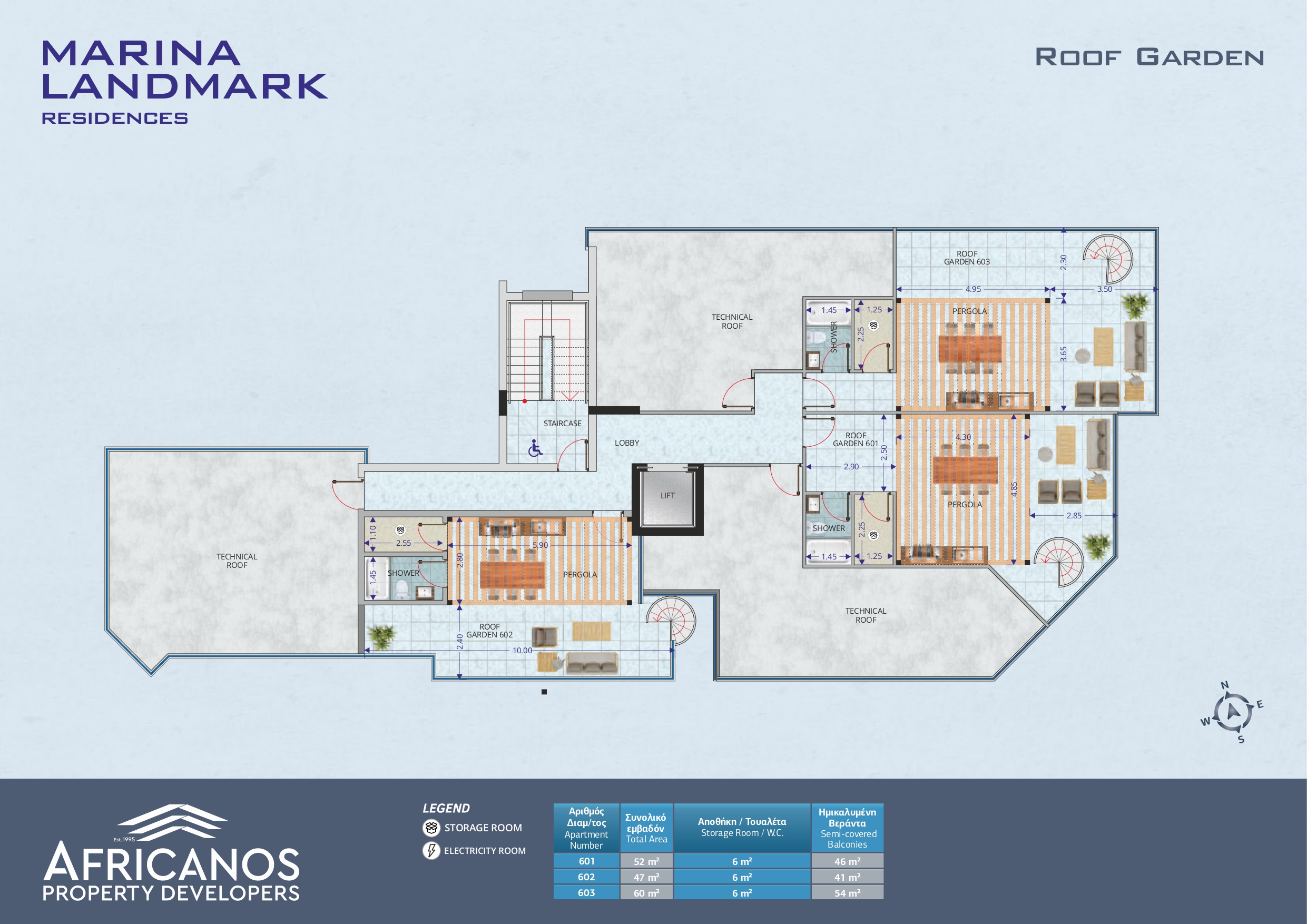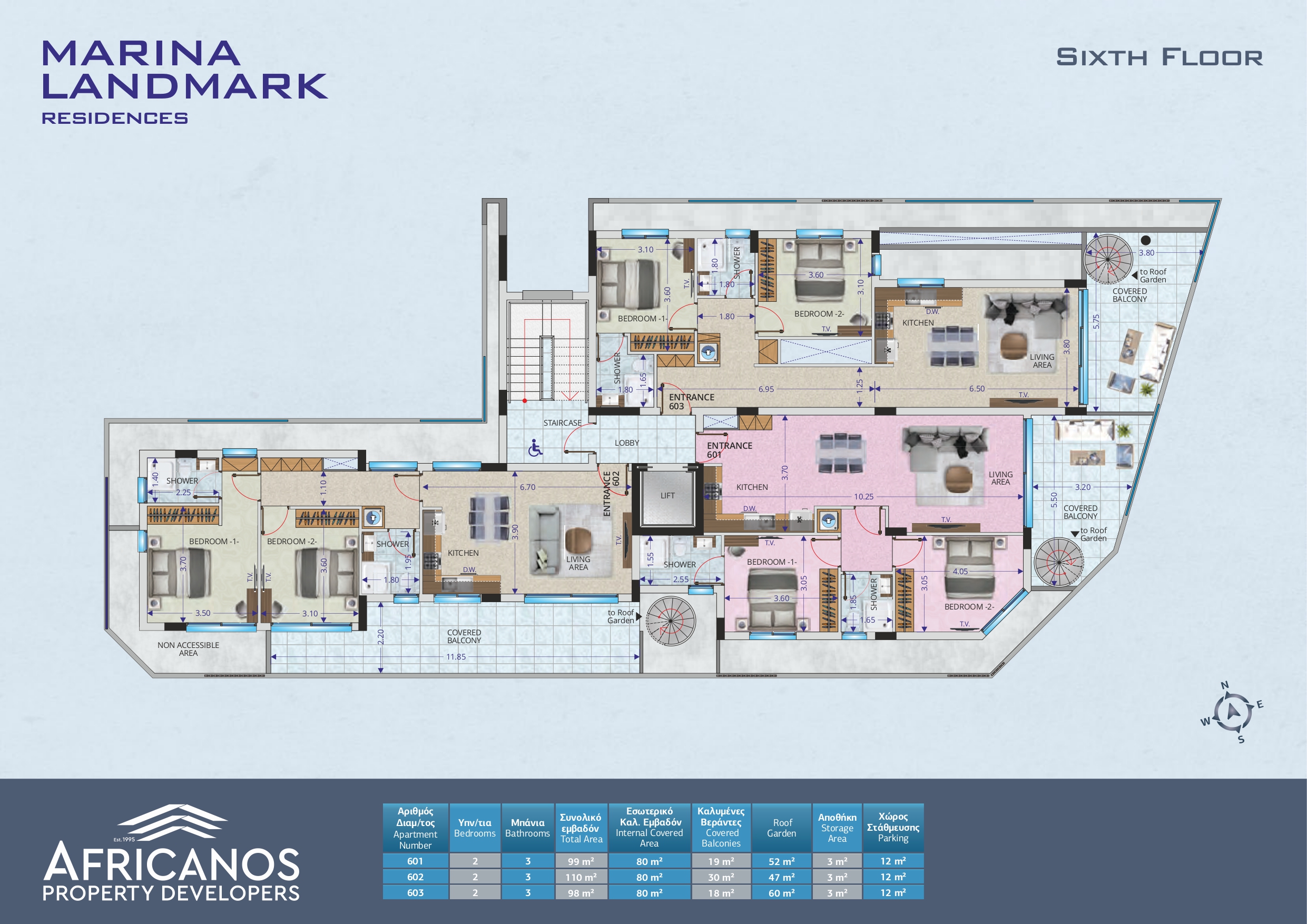 | Apartment No. | Price (€) | Bedrooms | Bathrooms | Internal Covered Area (m2) | Covered Balconies (m2) | Uncovered Balconies (m2) | Roof Garden (m2) | Parking and Storage |